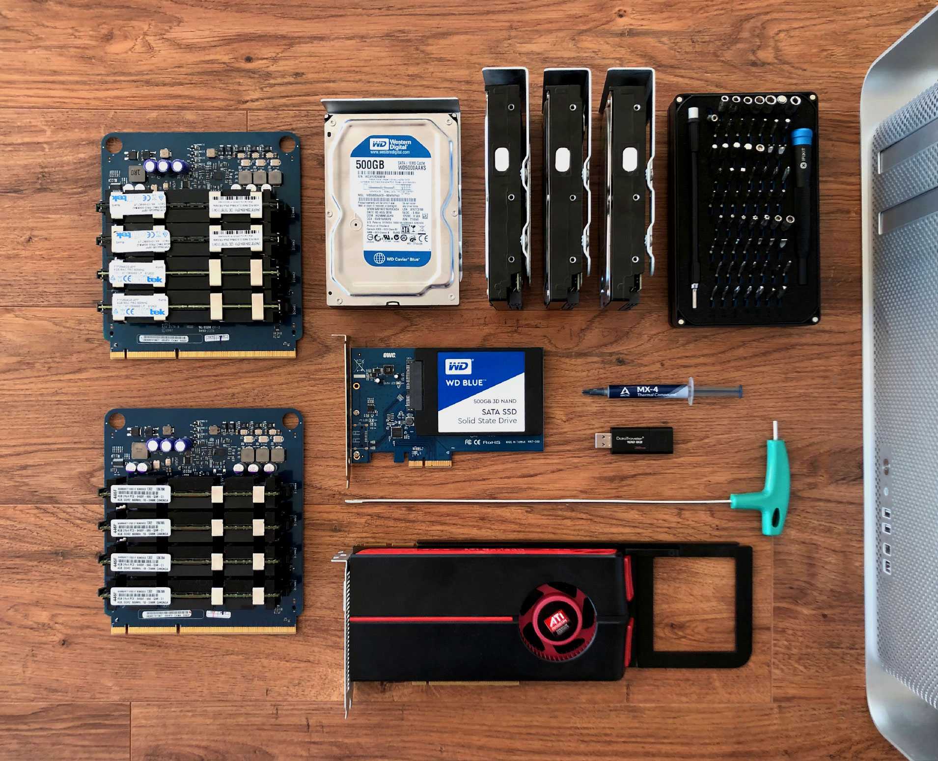 This led to the additional purchase of an OWC Accelsior S PCIe Adapter for 2.5" SATA III SSD Drives, which has the added benefit of faster read and write speeds over the SATA II ports, and a brand new 500GB Western Digital SSD to boot from. This modest shopping list left me with the following specification.